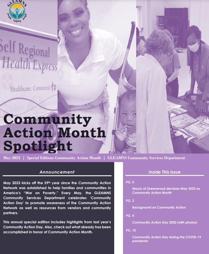 May 2023 kicks off Community Action Month! To kick off the agency's upcoming Community Action Day, a "spotlight" on Community Action Month is available from the GLEAMNS Community Services Department. This annual edition includes highlights from last year's Community Action Day at Piedmont Technical College. Also, check out what has already been accomplished this year in honor of Community Action Month. The edition wraps up with a "look-back" at how the GLEAMNS Community Services Department carried out Community Action Day during the height of the COVID-19 pandemic. Click here to view the May 2023 Community Action Spotlight: Special Edition.